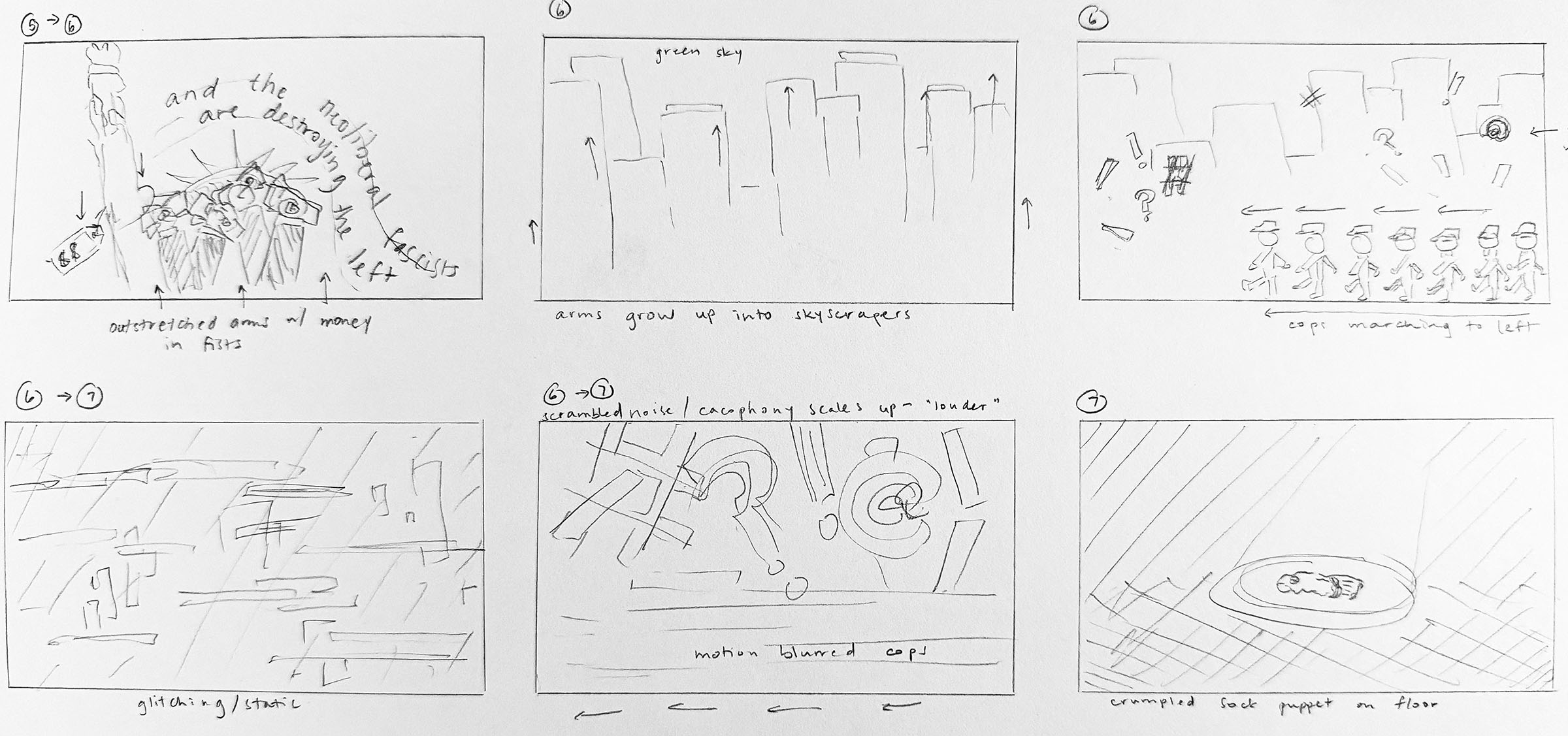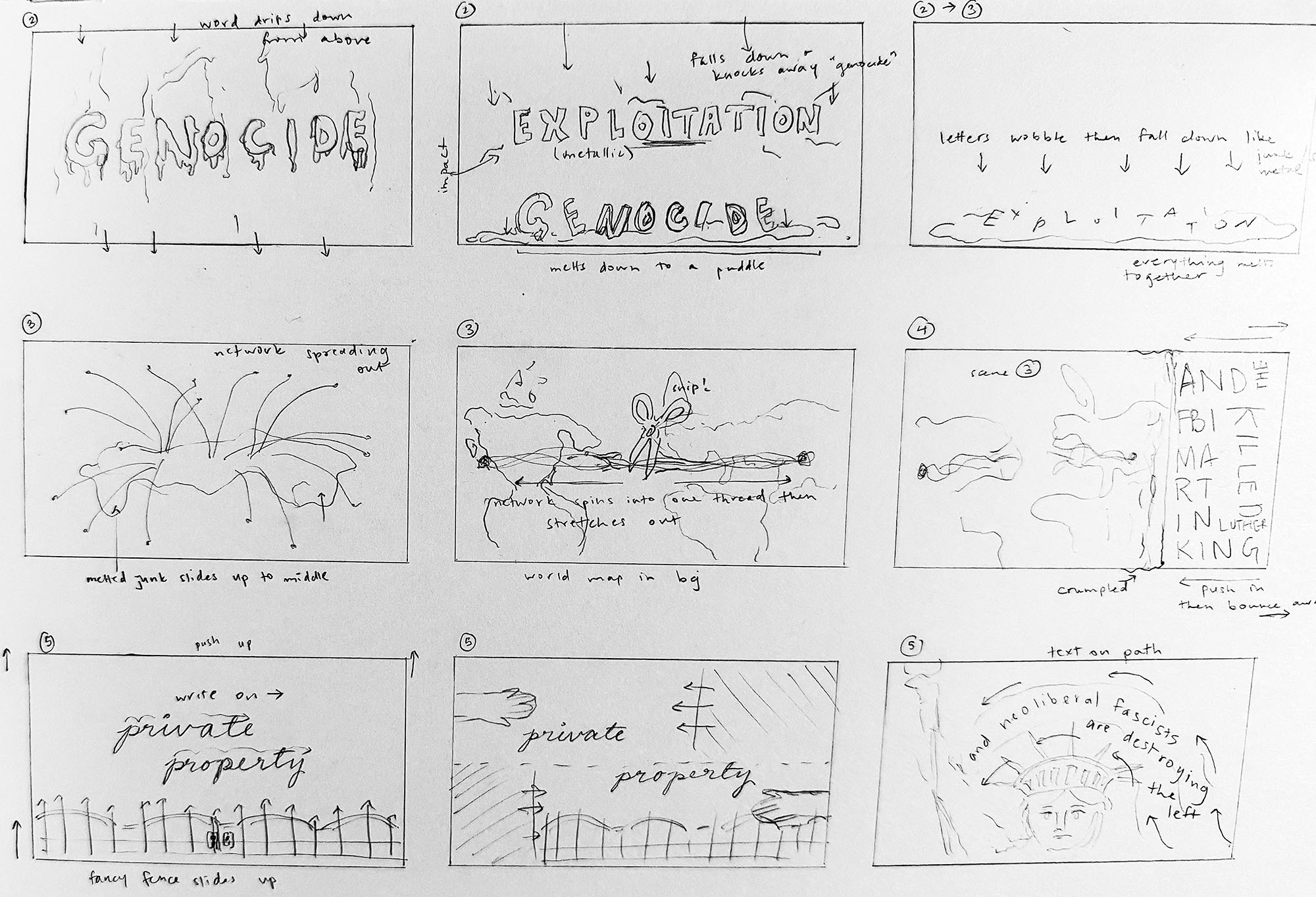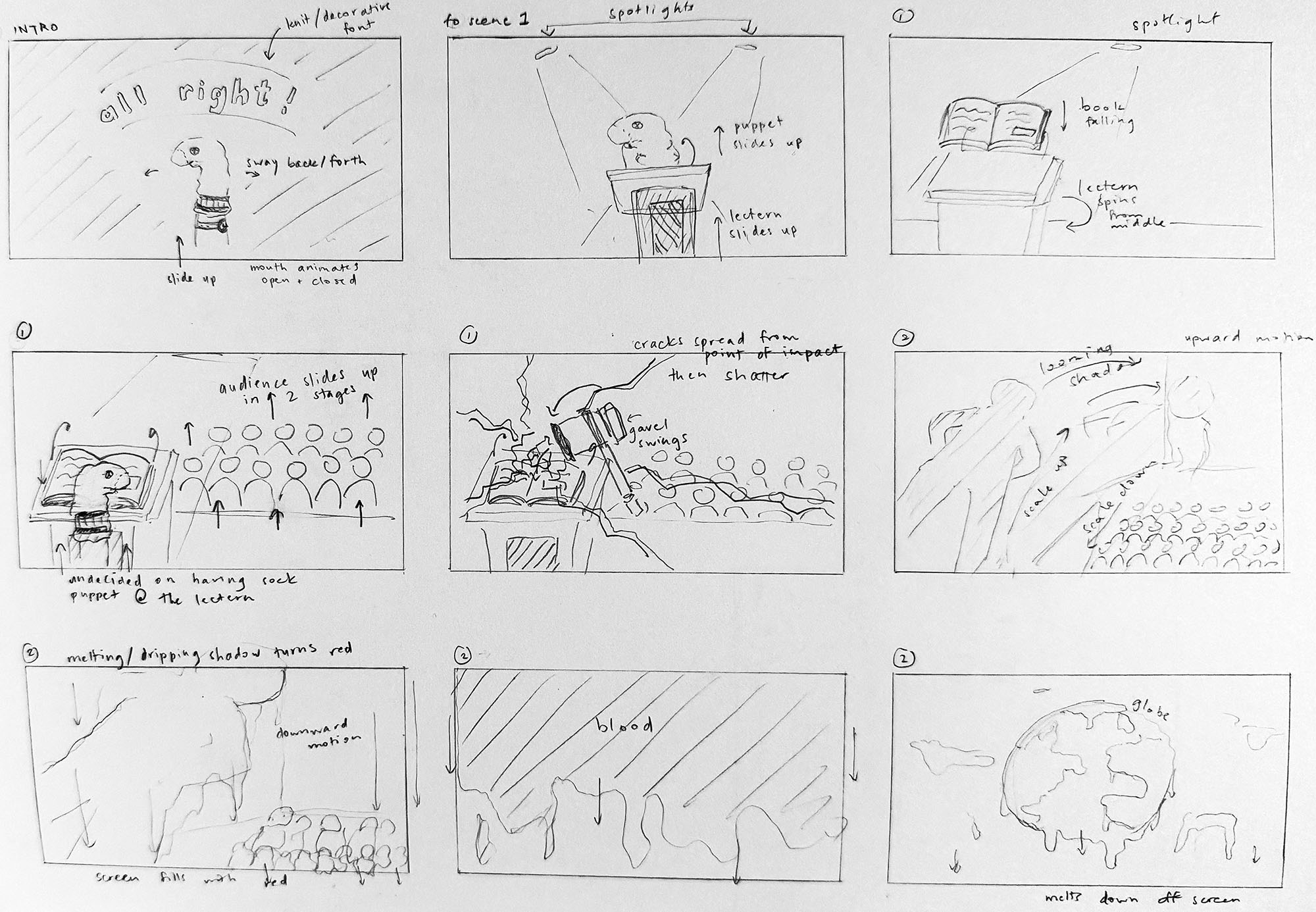 Since this animatic centered around an existing sound bite, our storyboards needed to follow the pre-defined timing, which provided us with a structure for which scenes would need more elaborate animation, and which would be simpler by necessity. I chose to incorporate visual metaphors in some scenes and animated typography in others for a more clearly defined break between scenes, which allowed for easier editing.